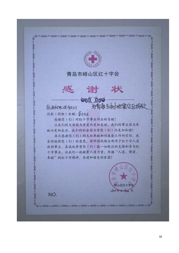 企業(yè)發(fā)展了不忘回報社會,在汶川大地震、玉樹大地震、支援西北建設工作、抗擊疫情、資助貧困學生、關愛患者家庭,無償捐款捐物數(shù)百萬元,做出了突出貢獻,并發(fā)起成立了“博愛基金會”,時刻對社會弱勢群體獻出愛心。